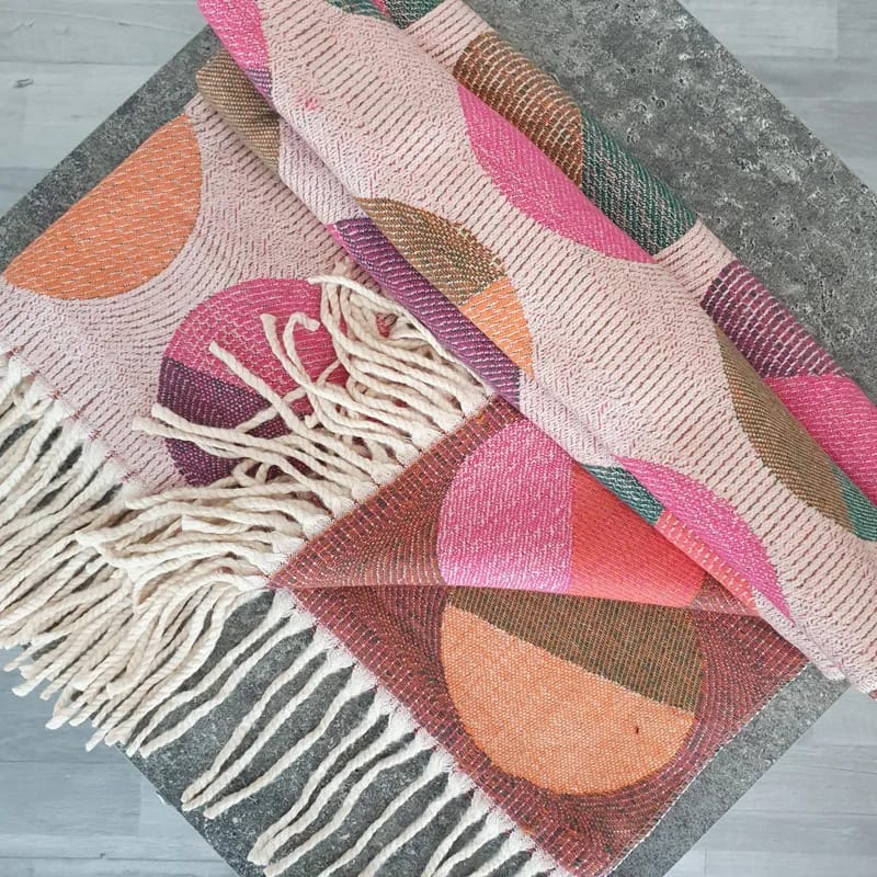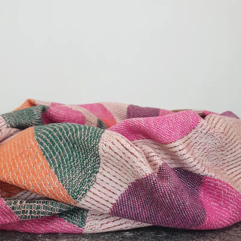 Zimski šal s pisanim vzorcem v bež, roza, zeleni, oranžni in vijolični barvi. Narejen je iz viskoze in je mehak na otip.