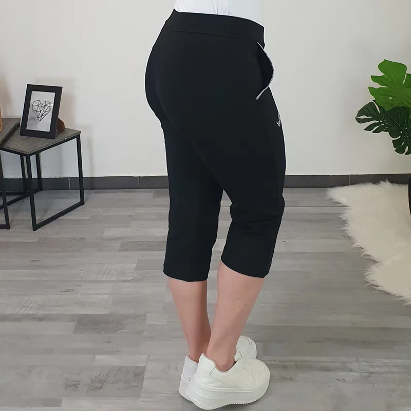 Športne hlače 1004 v črni barvi. Hlače imajo nišji pas na elastiko in dva stranska žepa. Hlačnice so ozke in 3/4 dolžine, so brez patenta. Izdelane so iz kvalitetnega bombaža in so prijetne za nošenje. Na voljo so od številke S do 2XL.