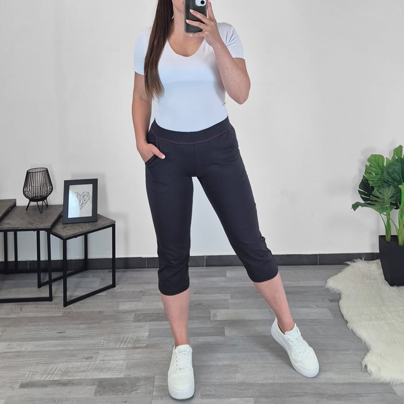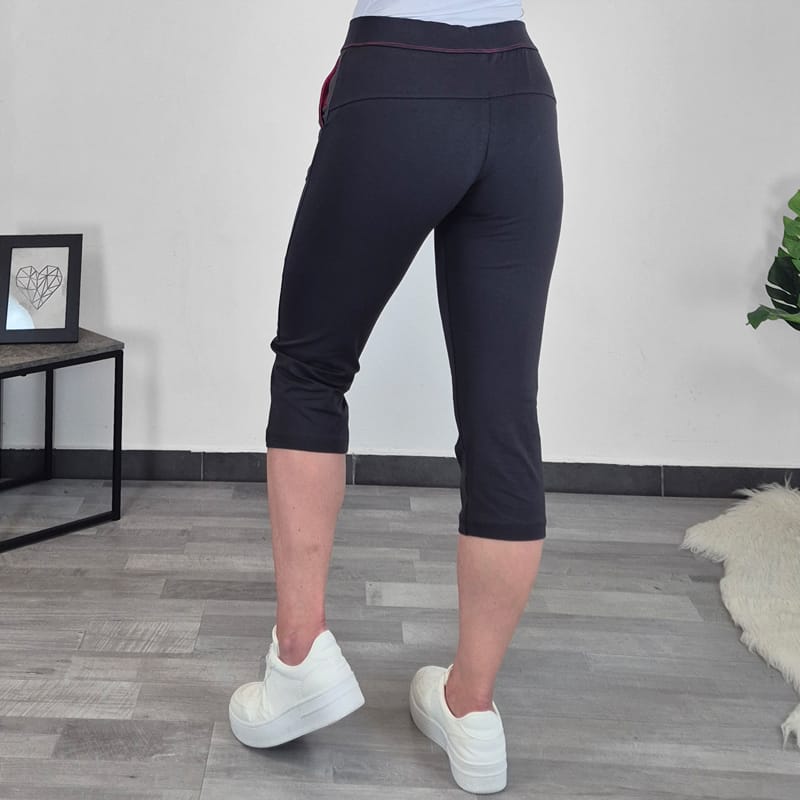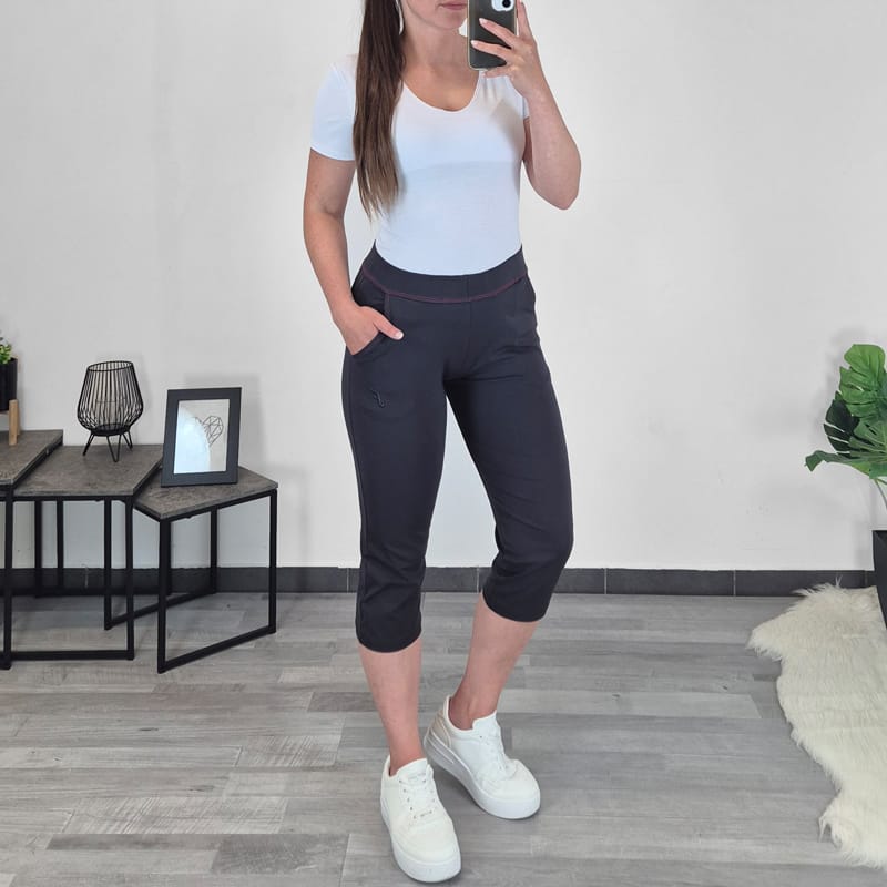 Športne hlače v sivii barvi. Hlače imajo pas na elastiko, dva stranska žepa, hlačnice so oprijete in dolžine 3/4. Pas in žepe krasijo dekorativni roza šivi. Izdelane so iz kvalitetnega bombaža in so udobne za nošenje.