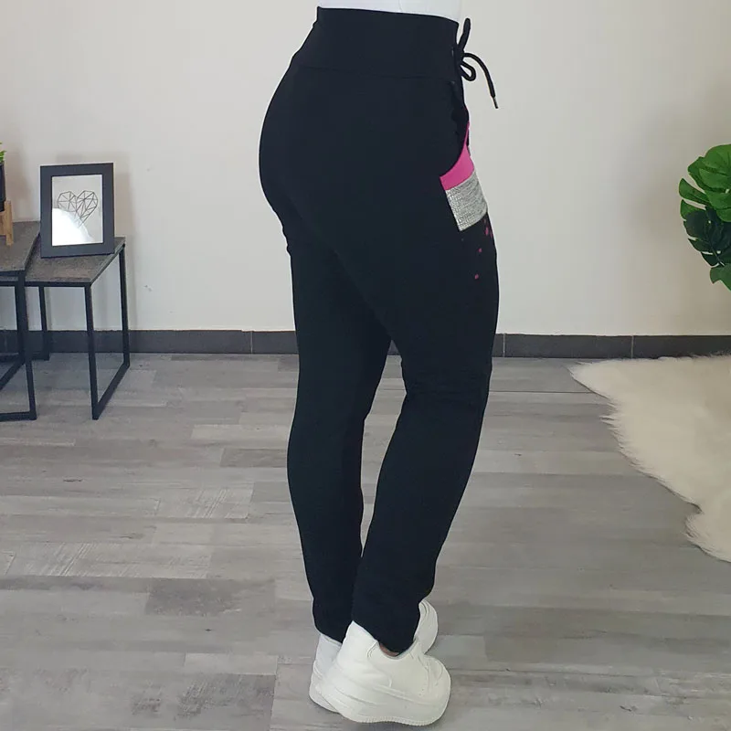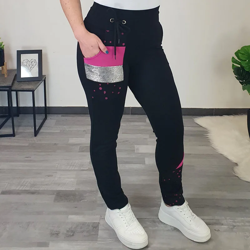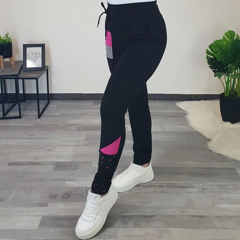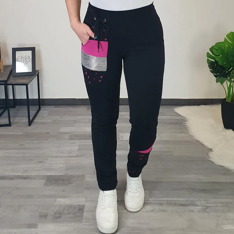 Modne bombažne hlače Adeja v črni barvi. Imajo višji pas, hlačnice so dolge in brez patenta. Na sprednji strani so okrašene z roza in srebrnim blagom ter tiskom pikic. Izdelane so iz kvalitetnega bombaža in so udobne za nošenje.