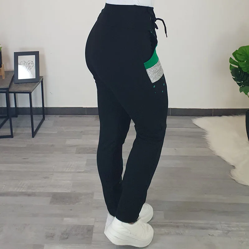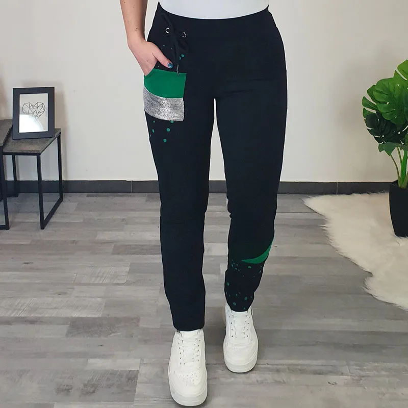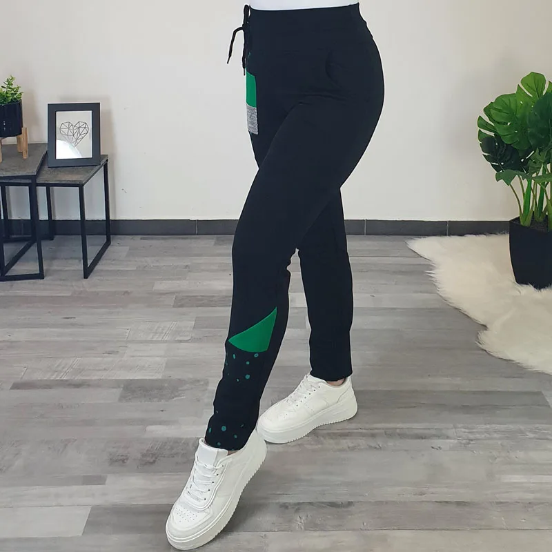 Modne bombažne hlače Adeja v črni barvi. Imajo višji pas, hlačnice so dolge in brez patenta. Na sprednji strani so okrašene z zelenim in srebrnim blagom ter tiskom pikic. Izdelane so iz kvalitetnega bombaža in so udobne za nošenje.