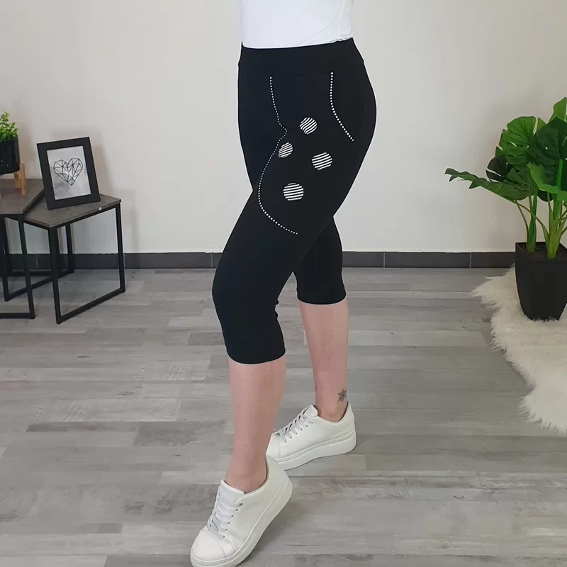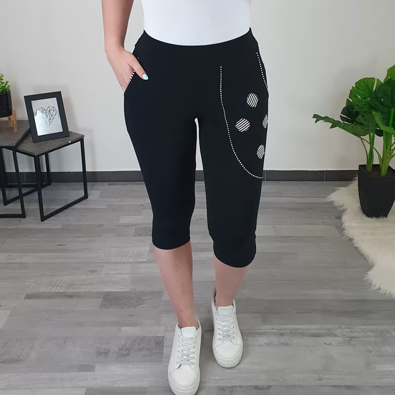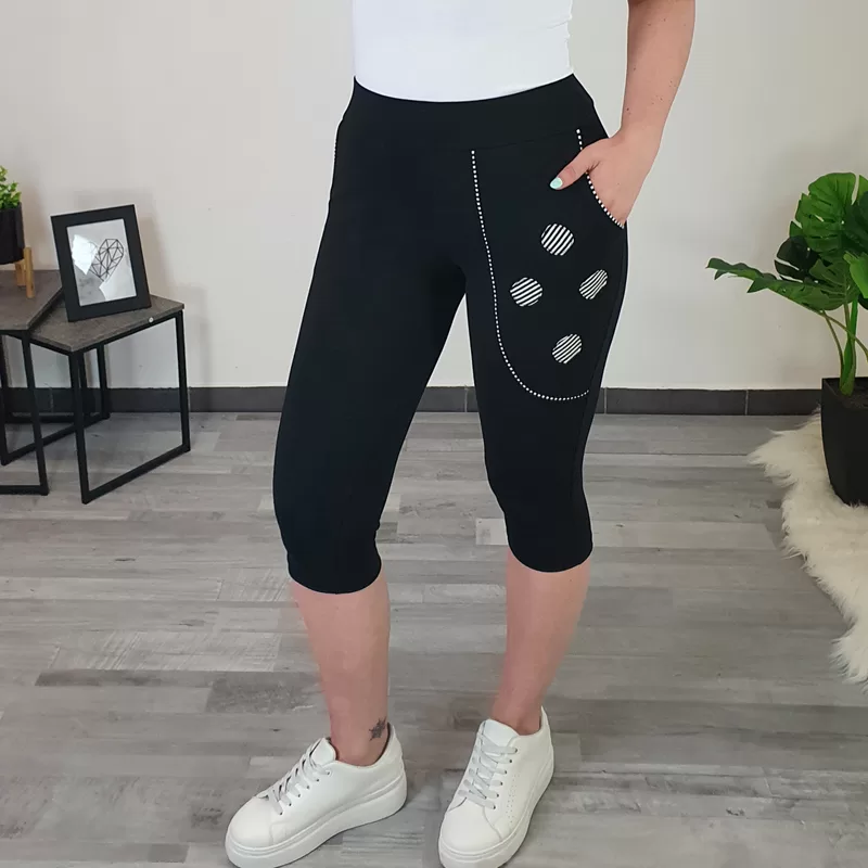 Športne bombažne hlače Kana v črni barvi. Hlače imajo višji pas, dva stranska žepa, hlačnice so ozke in 3/4 dolžine. Na desnem strani so dodani štirje krogi v kombinaciji črne in bele barve. Izdelane so iz kvalitetnega bombaža, ki ob nošenju ohranja svojo obliko. Hlače so odlična izbira za preživljanje prostih dni doma ali v naravi. Na voljo so od številke 36 d0 46.