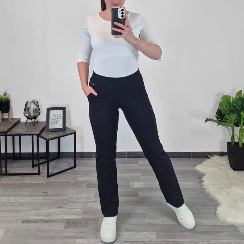 Bombažne športne hlače Rebeka v modri barvi. Hlače imajo višji pas na elastiko, hlačnice so dolge in širše, imajo dva stranska žepa. Izdelane so iz kvalitetnega bombaža in pri nošenju ohranjajo svojo obliko. Na voljo so od številke 38 do 50.