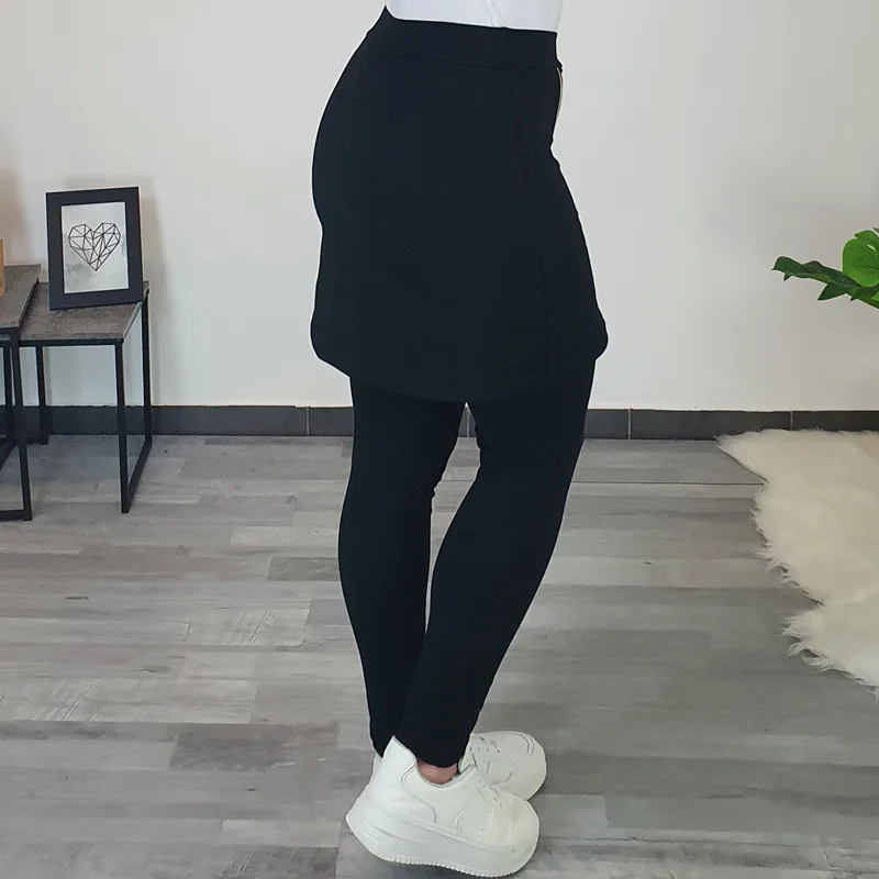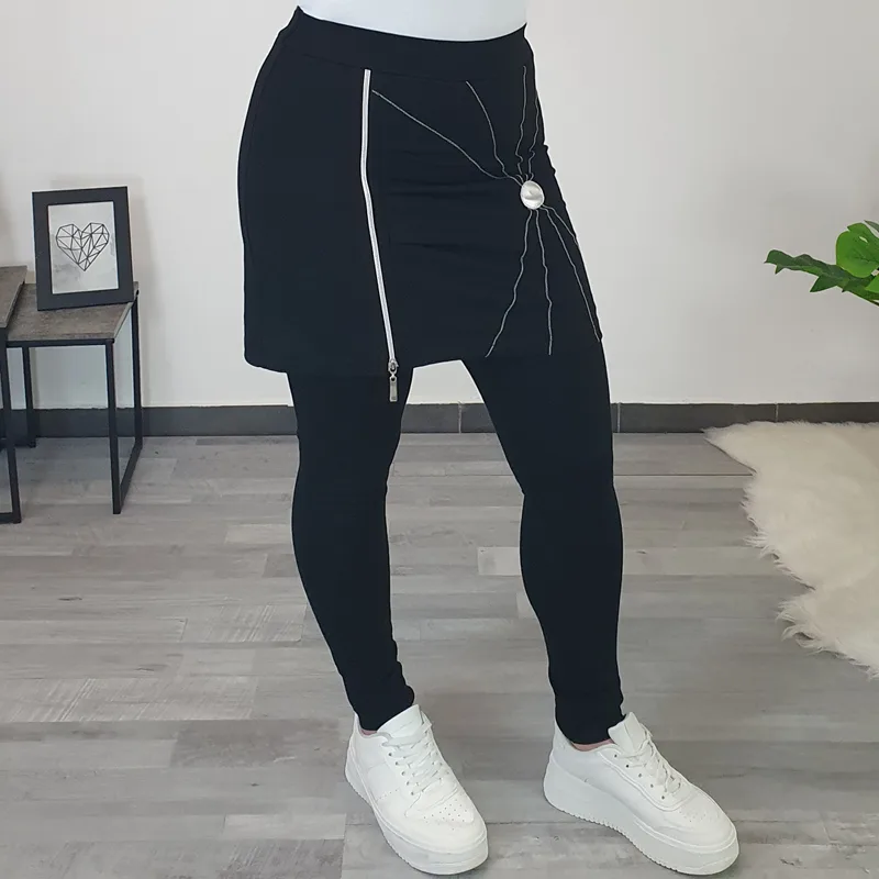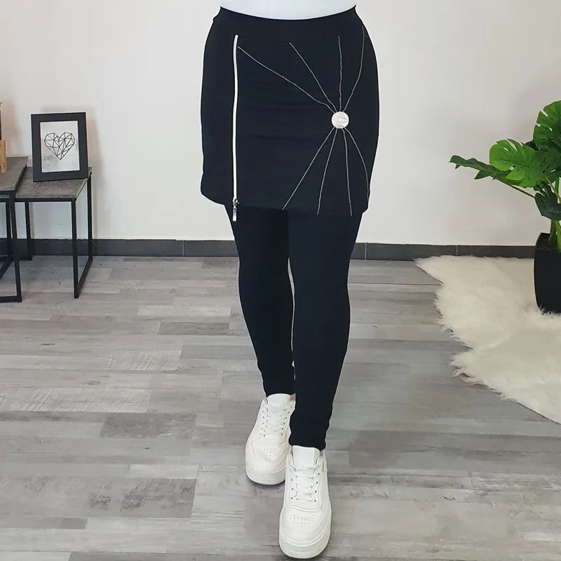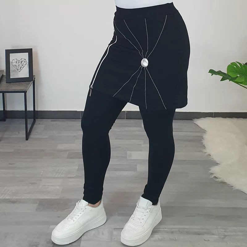 Modne hlače s krilom Petja v črni barvi. Hlačnice so dolge in oprijete, zgoraj je dodano bombažno krilo. Krilo krasi srebrna zadrga, srebrni šivi in srebrn krog. Izdelane so iz kvalitetnega bombaža in so udobne za nošenje.