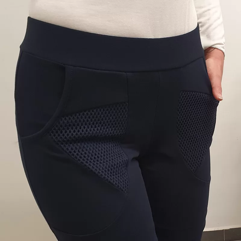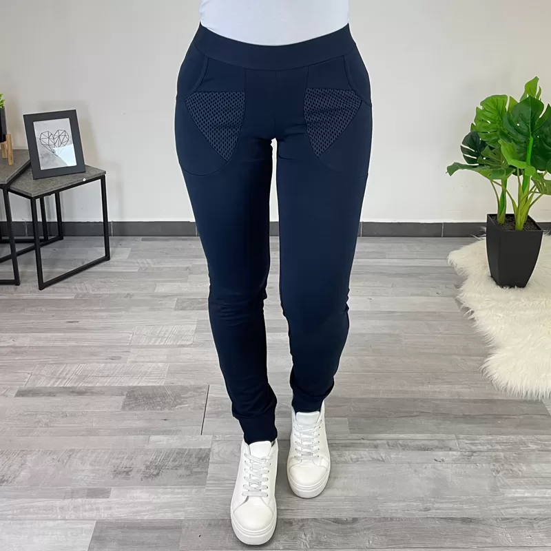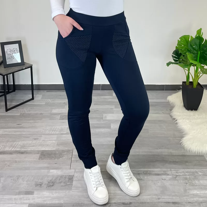 Bombažne športne hlače s patentom v temno modri barvi. Hlače imajo na žepih dodano mrežo.