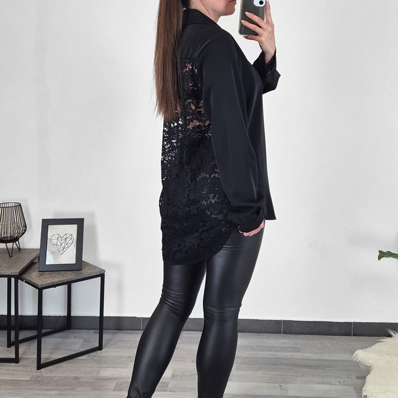Modna ženska srajca v črni barvi. Srajca je daljšega in širšega kroja, zadaj je podaljšana in narejena iz prosojne čipke. Čipka na zadnji strani daje srajci posebno zanmiv izgled. Rokava so dolga, zapenja se na gumbe. Velikost je univerzalna, primerna za velikost M do XL/XXL.