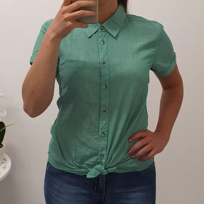 Srajca Kiki s črtastim vzorcem v beli in zeleni barvi. Srajca ima gumbe in se spodaj zaveže, na levi strani pa je prišit žep.