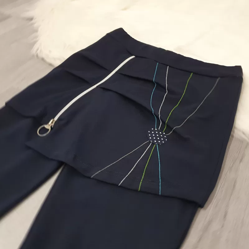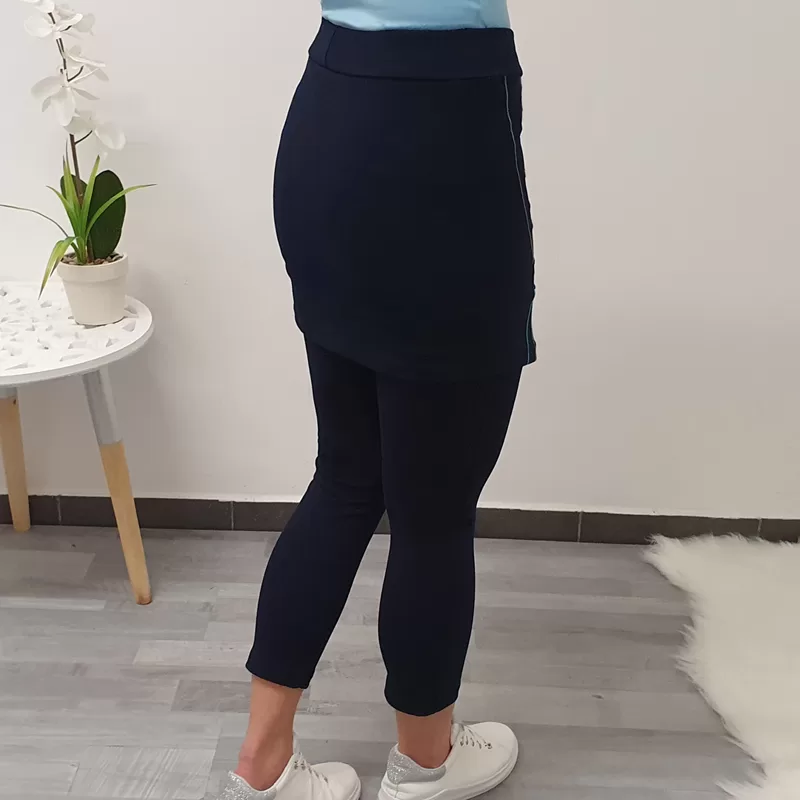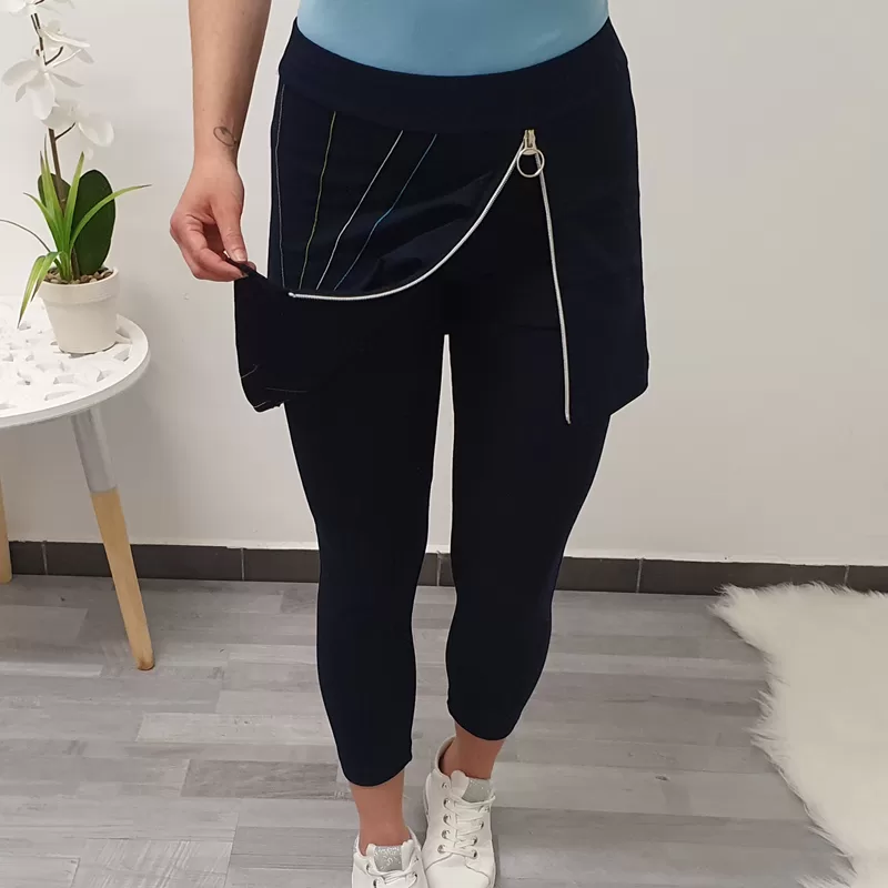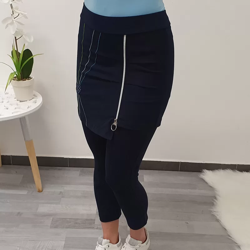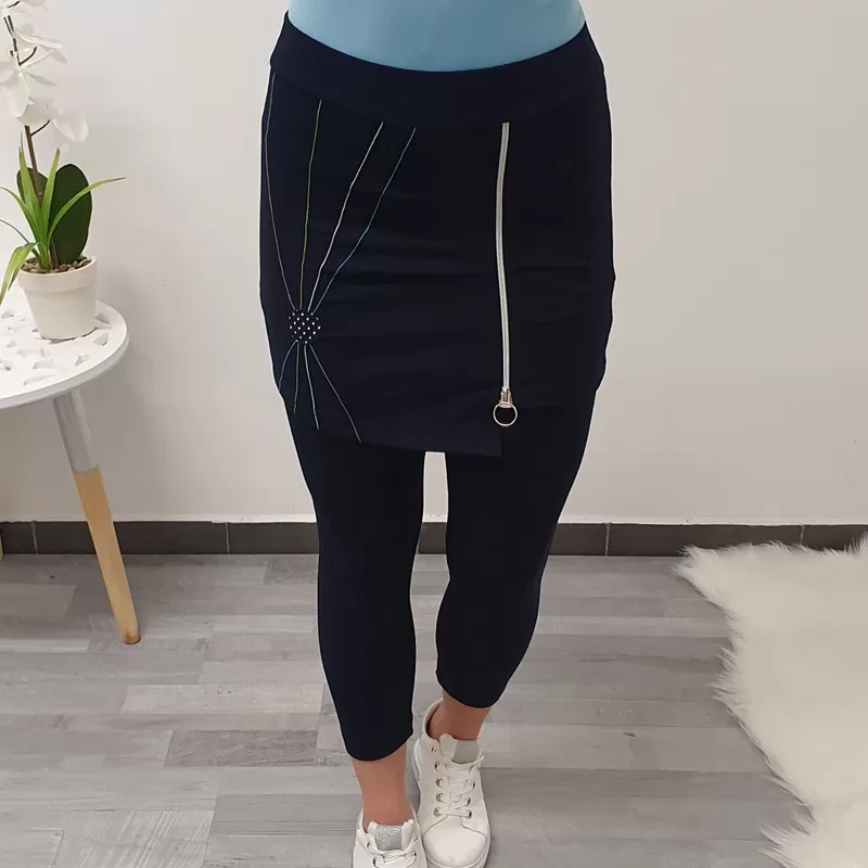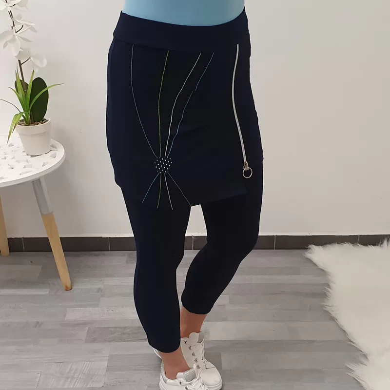 Temno modre hlače Janina v dolžini 7/8. Hlačam je dodano krilo, na krilu pa je dodana zadrga.