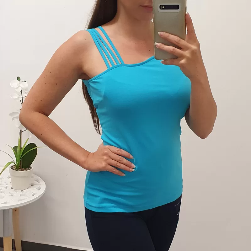 Majica brez rokav v modri barvi. Desna naramnica je narejena iz 4 trakov.