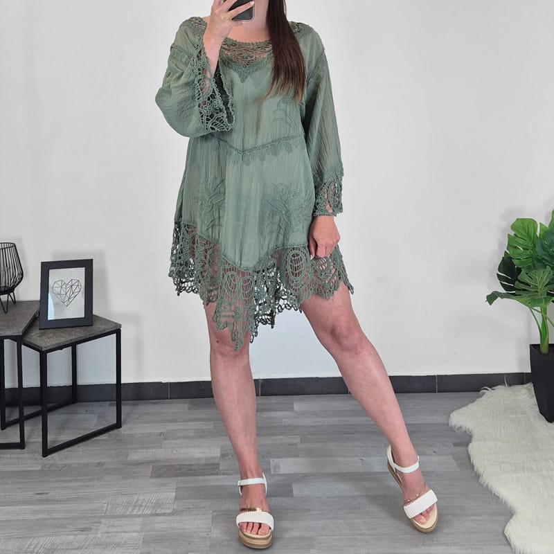 Ženska poletna tunika s kratkimi rokavi v olivno zeleni barvi. Kroj tunike je širši in asimetričen, okrašena je z pleteno čipko v zeleni barvi. Narejena je iz tankega bombaža in je odlična izbira za poletne dni. Lahko jo nosite tudi v kombinaciji s kopalkami. Velikost je univerzalna, primerna za L, XL, 2XL, 3XL