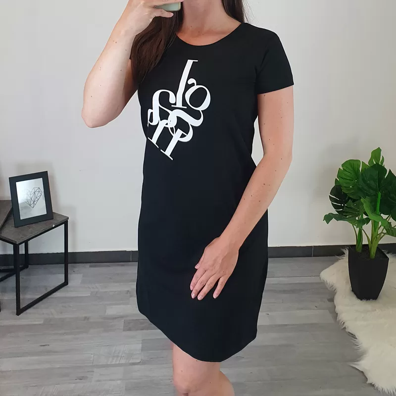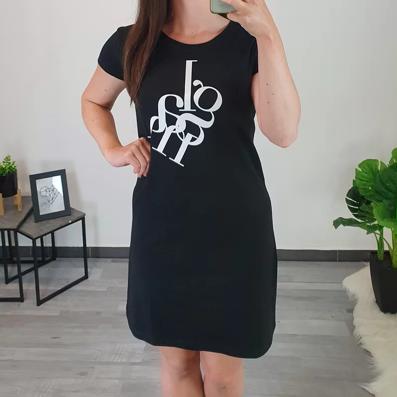 Ženska tunika s kratkimi rokavi. Tunika je v črni barvi, na sprednji strani je dodan napis ‘GLAM’ v beli. Tunika je narejena iz tanjšega bombaža in je primerna za poletne dni. Na voljo od velikosti S do XXL.