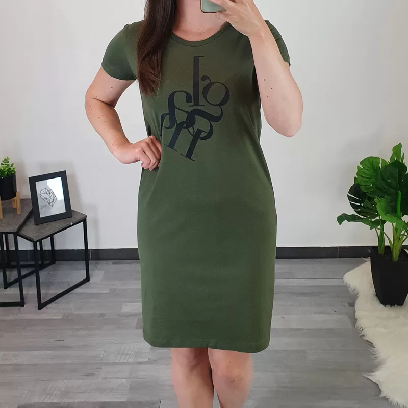 Ženska tunika s kratkimi rokavi. Tunika je v olivni barvi, na sprednji strani je dodan napis ‘GLAM’ v črni. Tunika je narejena iz tanjšega bombaža in je primerna za poletne dni. Na voljo od velikosti S do XL.