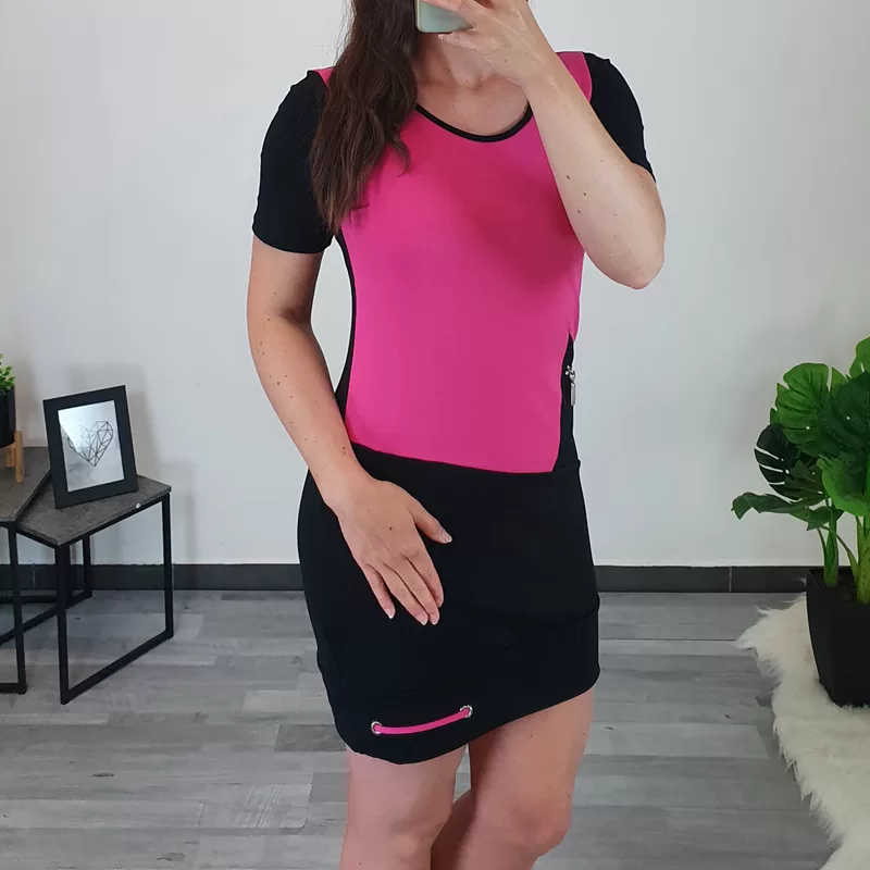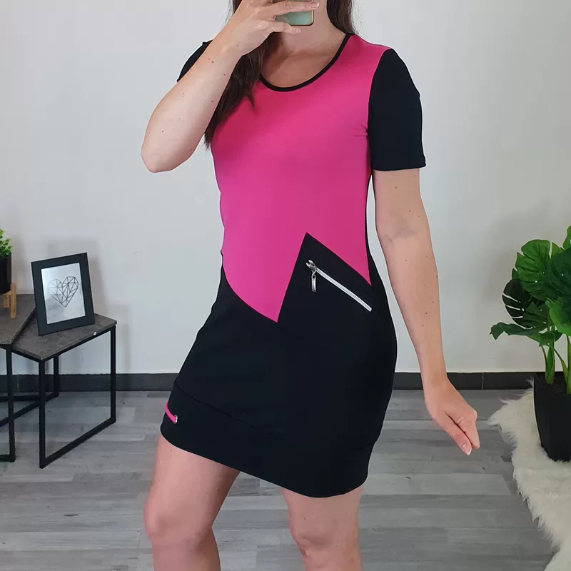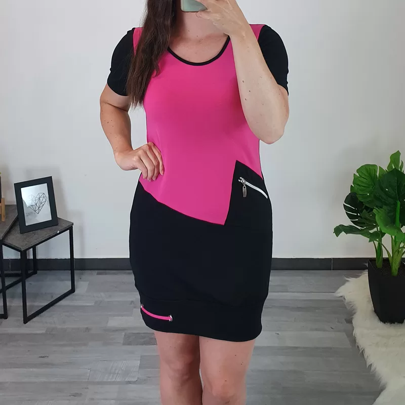 Ženska tunika Angela s kratkimi rokavi. Tunika je narejena iz tanjšega bombaža, primerna je za poletne dni. Tunika je v osnovi v črni barvi, na sprednji strani je v predelu prsi kombinirana z roza blagom, na desni strani pa je dodana dekorativna zadrga. Na spodnjem delu je dodan patent, ki tuniko lepo oblikuje, na patentu pa je dodana še roza vrvica.