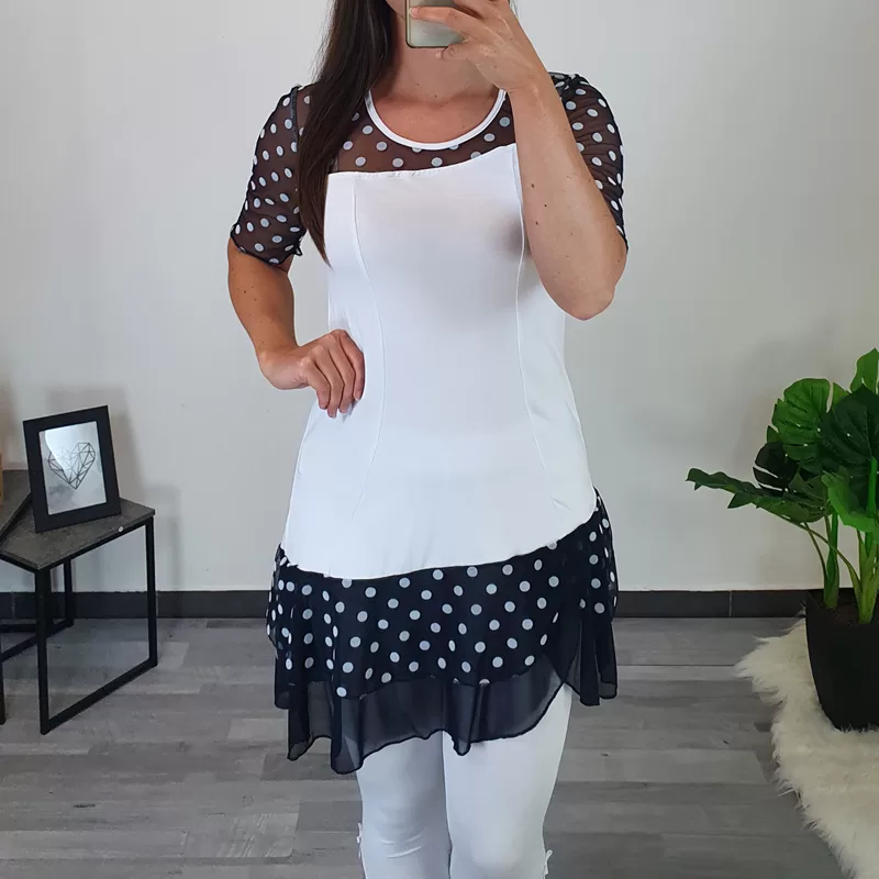 Modna ženska tunika April v beli barvi. Tunika ima kratka prozorna rokava, izdelana iz modrega tila z belimi pikicami. Enako blago je dodano še na spodnjem delu tunike. Izdelana je iz kvalitetne viskoze in se lepo prilagaja telesu. Na voljo je od številke 36 do 42.