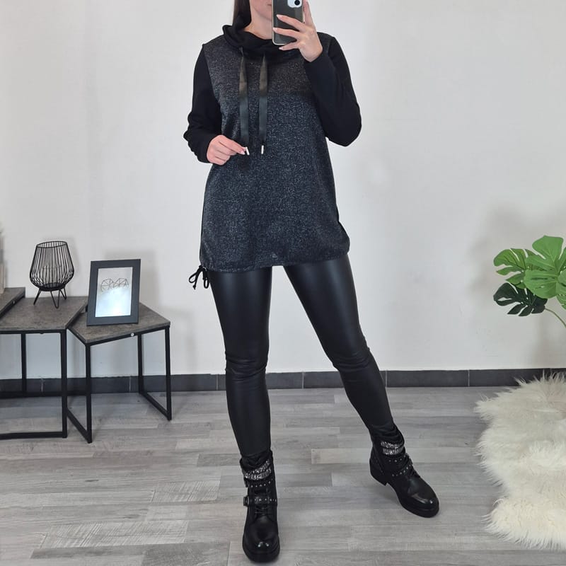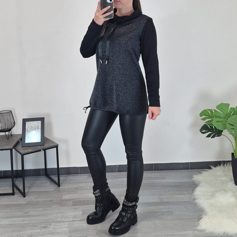 Ženska tunika Arja je narejena iz črnega blaga, na sprednji strani jo krasi črno blago z srebrnimi bleščicami. Tunika ima viseč ovratnik v črni barvi. Ima dolga rokava, na spodnjem delu pa je dodana vrvica s katero lahko tuniko oblikujete.