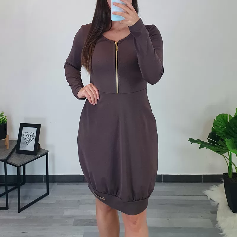 Tunika Blaža je krojena na ‘balon’, na spodnjem delu je dodan patent, ki tuniko lepo oblikuje. Tunika ima dodano zlato zadrgo, na levi strani patenta pa sta dodana dva neta in zlat trak. Tunika je v rjavi barvi. Tunika se odlično poda tako na superge kot tudi na škornje. Izdelana je iz kvalitetnega bombaža, krojena je od številke 38 do 50.