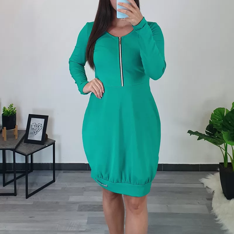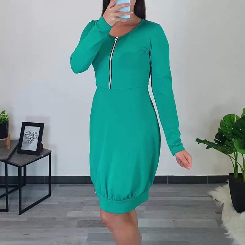 Tunika Blaža je krojena na ‘balon’, na spodnjem delu je dodan patent, ki tuniko lepo oblikuje. Tunika ima dodano srebrno zadrgo, na levi strani patenta pa sta dodana dva neta in srebrn trak. Tunika je v zeleni barvi. Tunika se odlično poda tako na superge kot tudi na škornje. Izdelana je iz kvalitetnega bombaža, krojena je od številke 38 do 50.