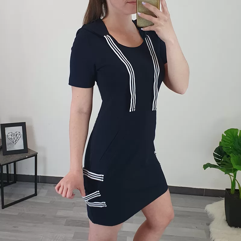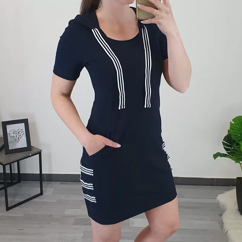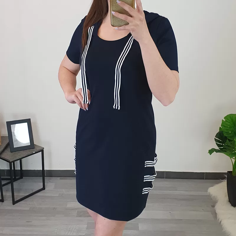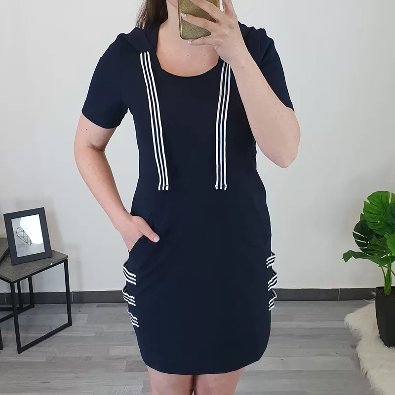 Ženska tunika Celesta v temno modri barvi. Tunika ima kratka rokava in kapuco, dodan je črtasti trak. Na sprednji strani ima žepe, ob straneh pa so prišiti še trije črtasti trakovi. Tunika je narejena iz bombaža, krojena je od velikosti 36 do 46.