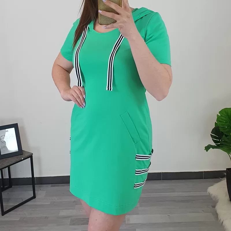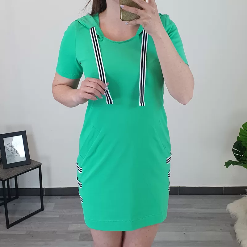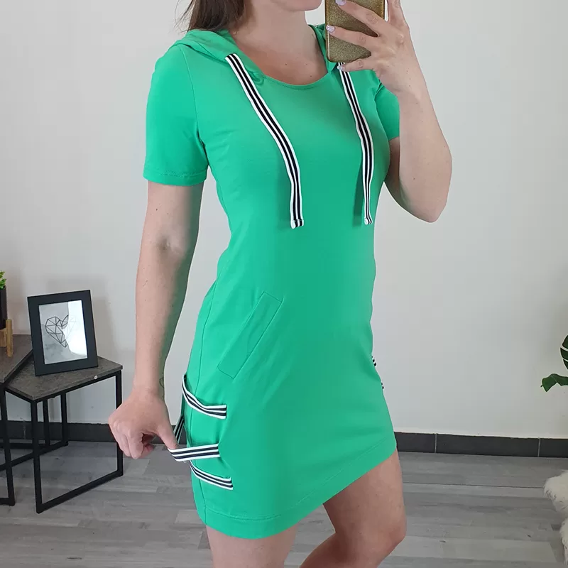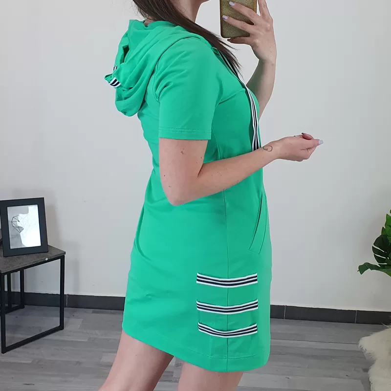 Ženska tunika Celesta v zeleni barvi. Tunika ima kratka rokava in kapuco, dodan je črtasti trak. Na sprednji strani ima žepe, ob straneh pa so prišiti še trije črtasti trakovi. Tunika je narejena iz bombaža, krojena je od velikosti 36 do 46.