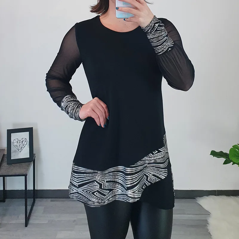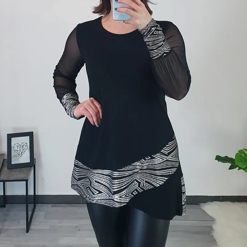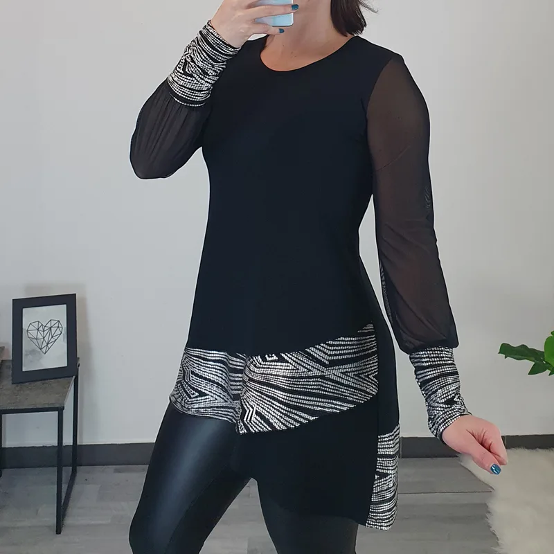 Modna tunika Danaja v kombinaciji črne barve in srebrnega blaga. Tunika ima dolga prosojna rokava, ki se zaključujejo s patentom. Je asimetričnega kroja, v predelu prsi je oprijeta, nato pa krojena navzven. Izdelana je iz kvalitetne viskoze in je prijetna za nošenje.