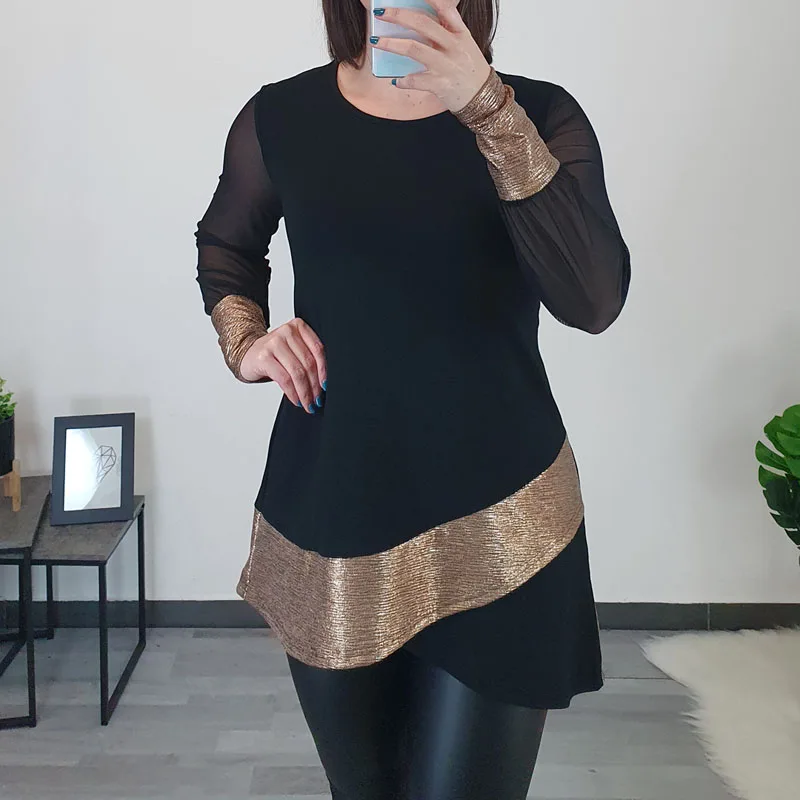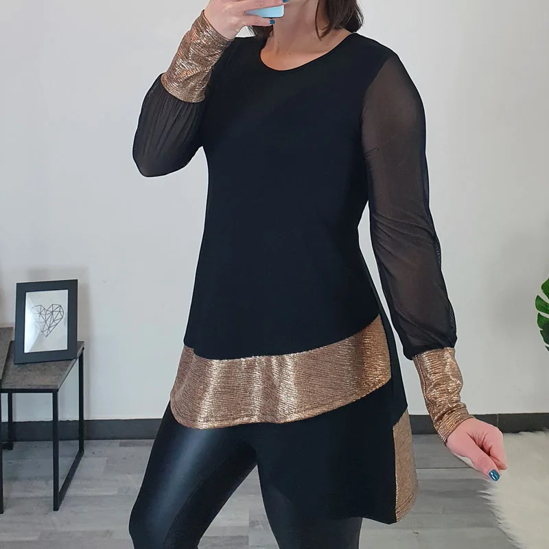 Modna tunika Danaja v kombinaciji črne barve in zlatega blaga. Tunika ima dolga prosojna rokava, ki se zaključujejo s patentom. Je asimetričnega kroja, v predelu prsi je oprijeta, nato pa krojena navzven. Izdelana je iz kvalitetne viskoze in je prijetna za nošenje.