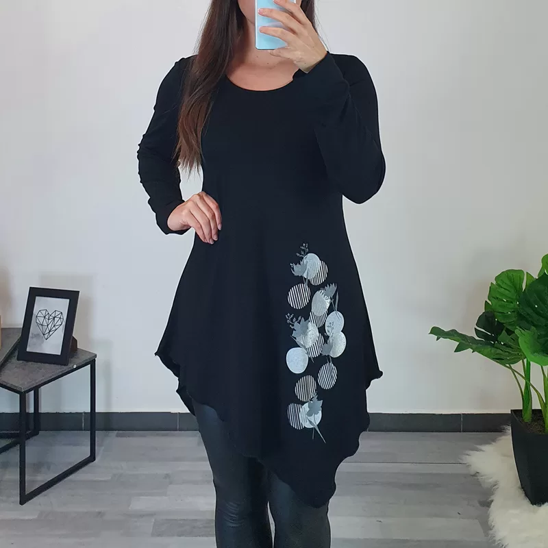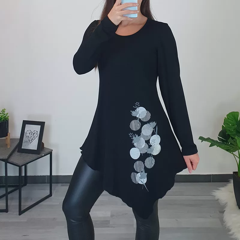 Ženska tunika z dolgimi rokavi v črni barvi. Tunika je asimetrična, krojena je na ‘A’, kar pomeni, da je v prsih ožja in spodaj širša, primerna je za vse postave. Narejena je iz viskoze, je zračna, tanka in lepo pade. Na sprednji desni strani tunike je dodan tisk. Tunika je na voljo od velikosti 40 do 52.