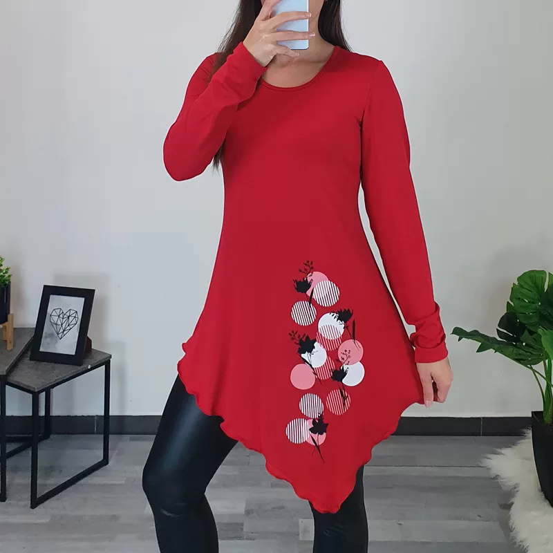 Ženska tunika z dolgimi rokavi v rdeči barvi. Tunika je asimetrična, krojena je na ‘A’, kar pomeni, da je v prsih ožja in spodaj širša, primerna je za vse postave. Narejena je iz viskoze, je zračna, tanka in lepo pade. Na sprednji desni strani tunike je dodan tisk. Tunika je na voljo od velikosti 40 do 52.