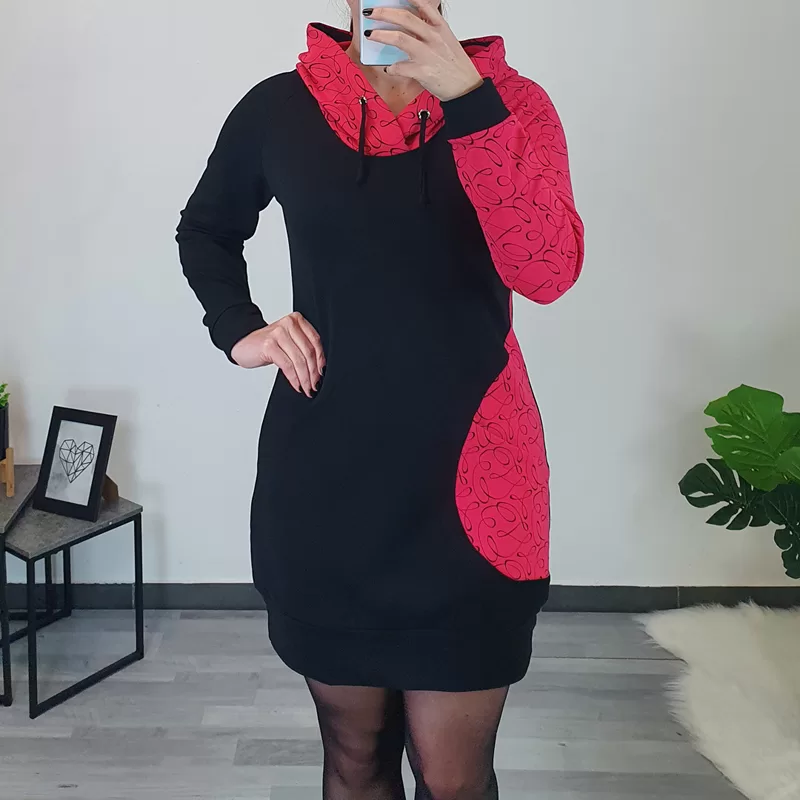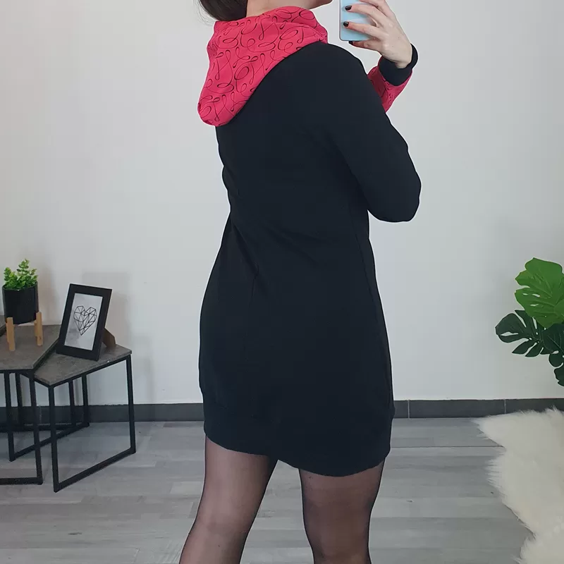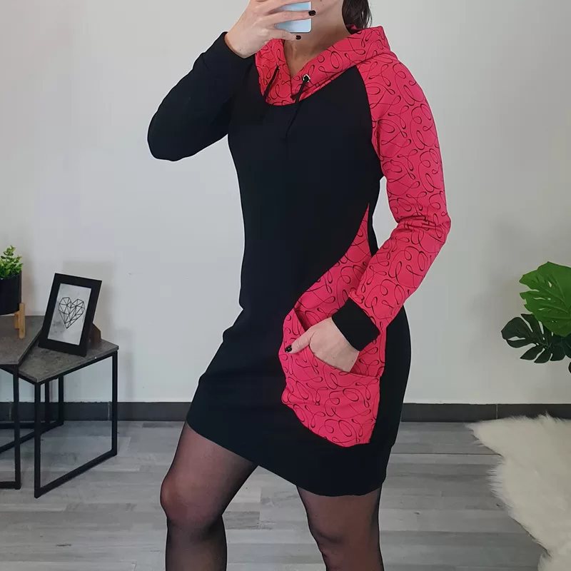 Ženska športna tunika Darka je narejena iz kvalitetnega bombaža, ki ob nošenju ohranja svojo obliko. Tunika ima kapuco in žep na desni strani. Tunika je v osnovi v črni barvi, kapuca, desni rokav in žep pa so kombinirani z roza blagom s črnim vzorcem.