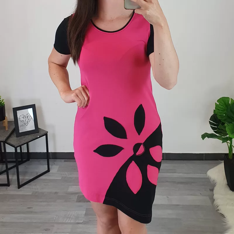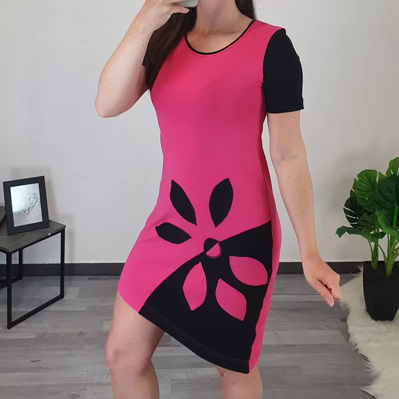 Ženska tunika Daša je narejena iz tanjšega bombaža in je primerna za toplejše dni. Tunika je na sprednjem in hrbtnem delu v roza barvi, rokava pa so v črni. Tunika je na desni sprednji strani kombinirana s črnim blagom, prišita je še cvet v črni in roza. Tunika je asimetričnega kroja, narejena od velikosti 36 do 48.