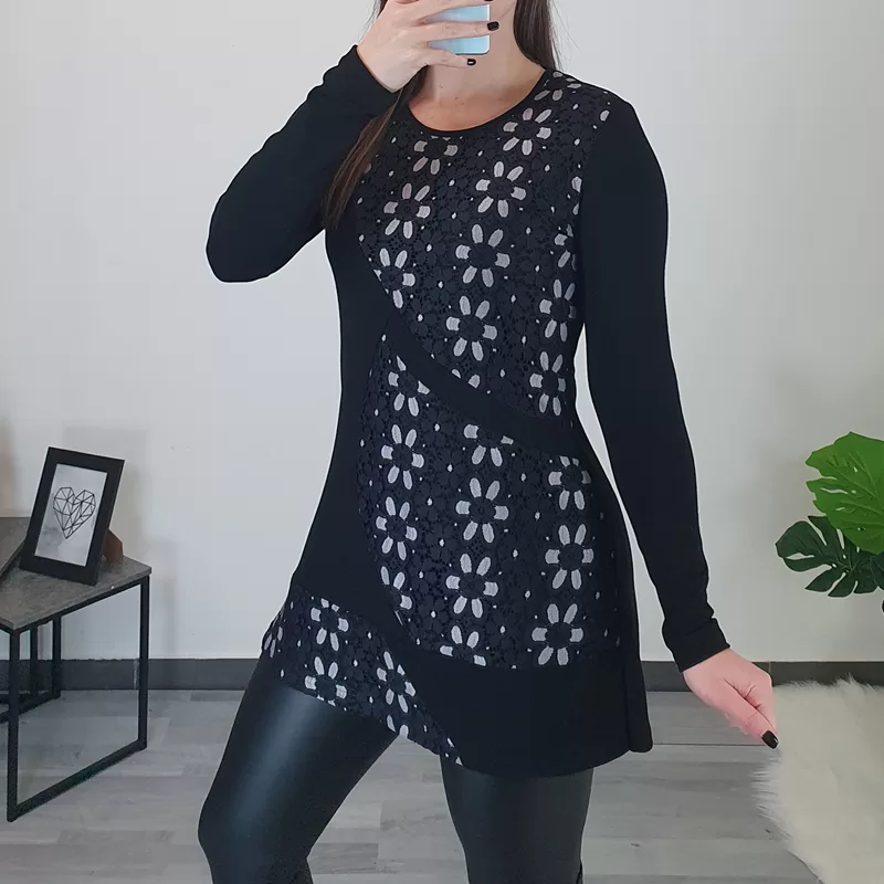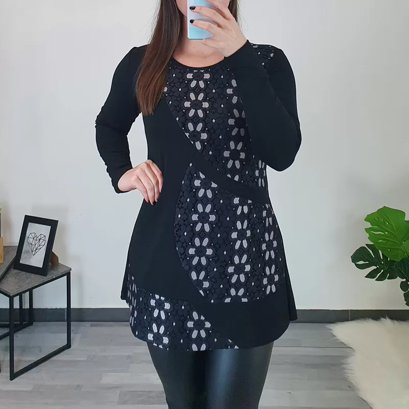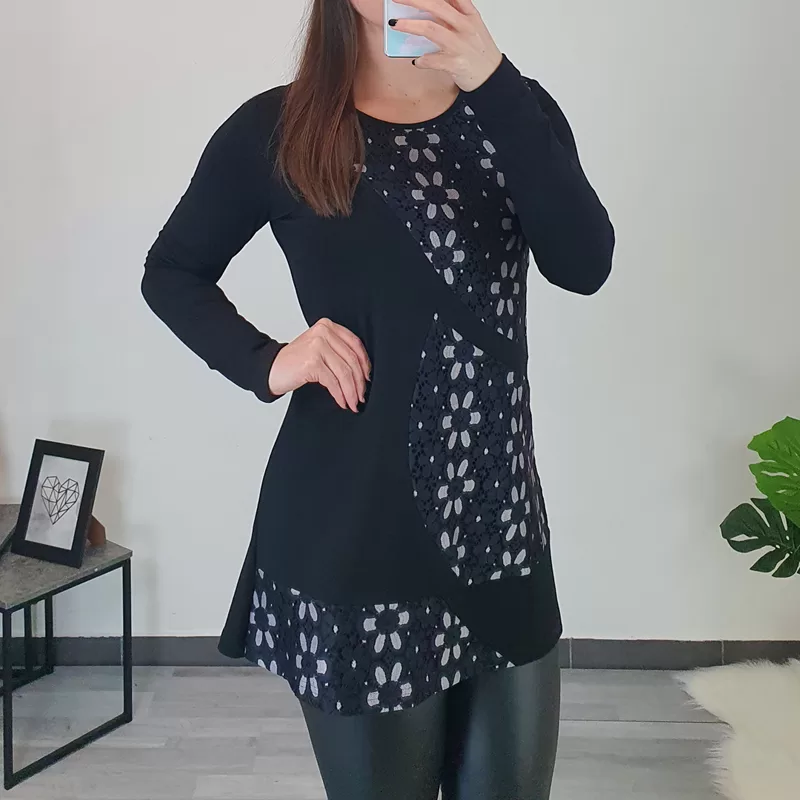 Ženska elegantna viskozna tunika Dea v črni barvi. Na sprednji stani je kombinirana s čipkastim blagom v cvetličnem vzorcu. Tunika ima dolga rokava in je krojena malenkost na ‘A’ – v prsih je ožja, spodaj širša in lepo pade.