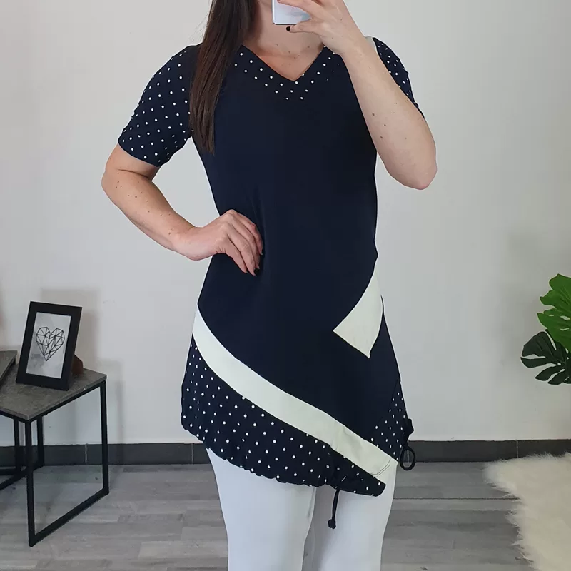Modna tunika Deja v kombinaciji temno modre in bele barve. Tunika ima kratka rokava in ovratnik na V. Kroj tunike je asimetričen, v predelu prsi je ožji, nato pa krojen navzven. Na koncu so dodane vrvice, da lahko tuniko oblikujete.