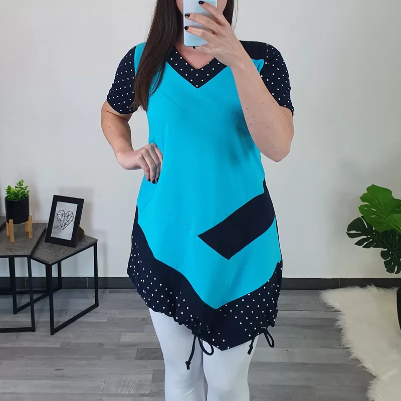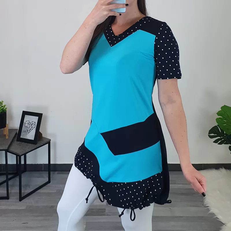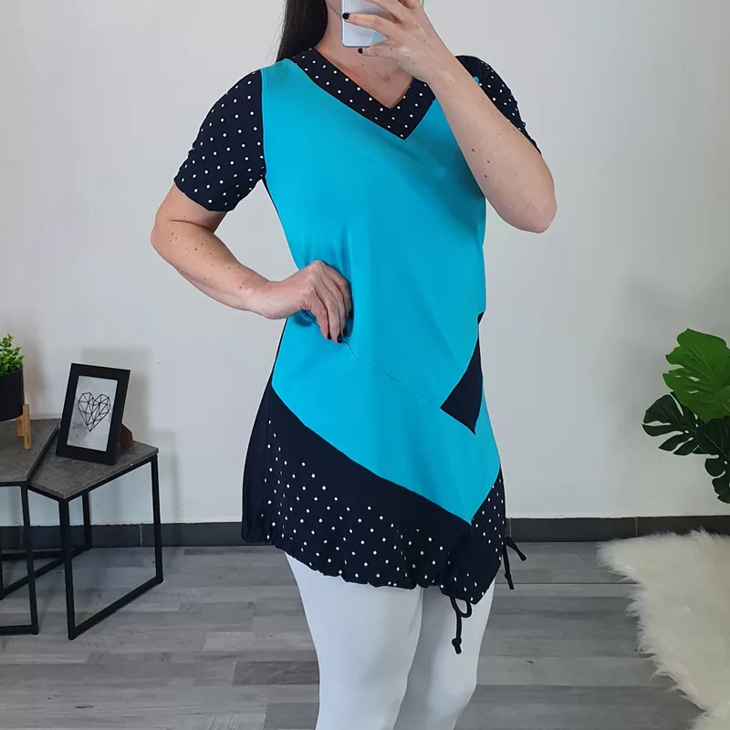 Modna tunika Deja v kombinaciji temno modre in modre barve. Tunika ima kratka rokava in ovratnik na V. Kroj tunike je asimetričen, v predelu prsi je ožji, nato pa krojen navzven. Na koncu so dodane vrvice, da lahko tuniko oblikujete.