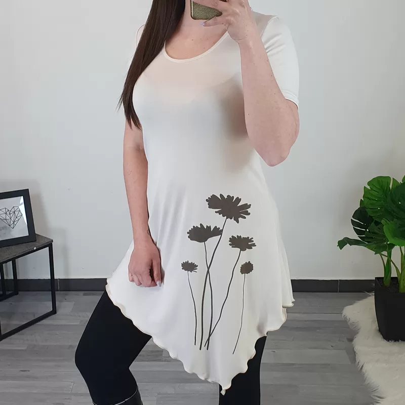 Ženska tunika s kratkimi rokavi v bež barvi. Tunika je asimetrična, krojena je na ‘A’, kar pomeni, da je v prsih ožja in spodaj širša, primerna je za vse postave. Narejena je iz viskoze, je zračna in tanka, odlična za toplejše dni. Na sprednji strani tunike je dodan tisk rož v rjavi.