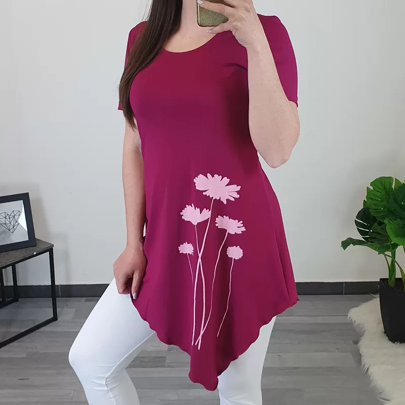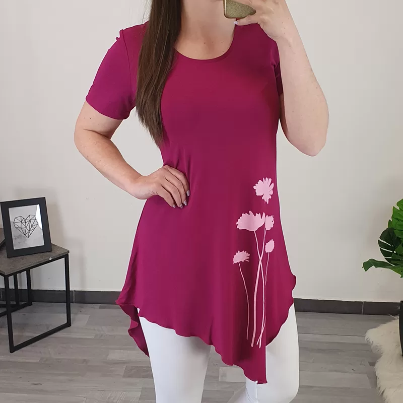 Ženska tunika s kratkimi rokavi v ciklam vijolični barvi. Tunika je asimetrična, krojena je na ‘A’, kar pomeni, da je v prsih ožja in spodaj širša, primerna je za vse postave. Narejena je iz viskoze, je zračna in tanka, odlična za toplejše dni. Na sprednji strani tunike je dodan tisk rož v svetlo roza.