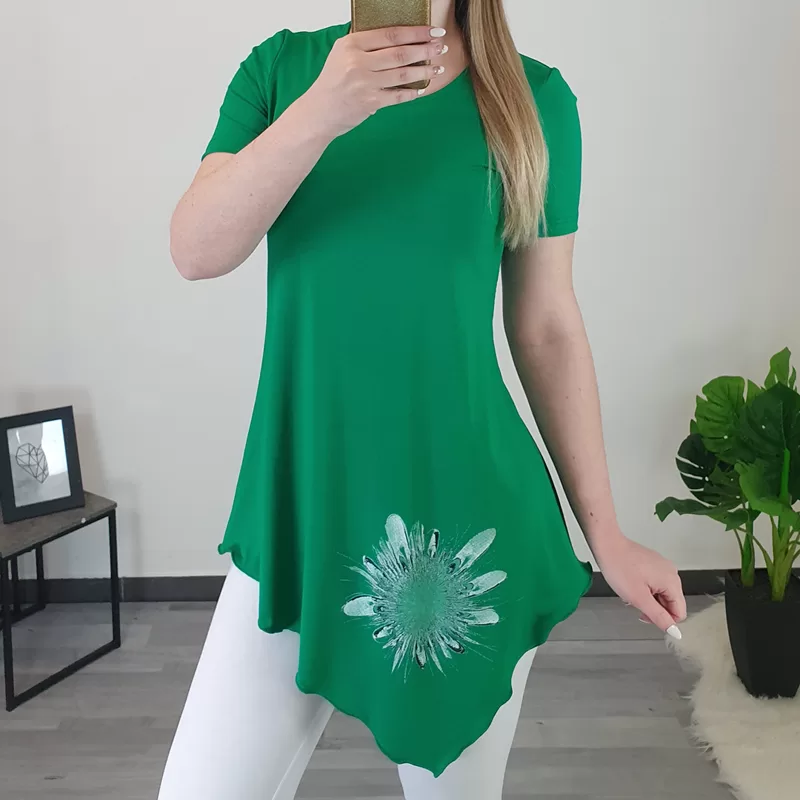 Ženska tunika Desire s kratkimi rokavi v zeleni barvi. Tunika je asimetrična, krojena je na ‘A’, kar pomeni, da je v prsih ožja in spodaj širša, primerna je za vse postave. Narejena je iz kvalitetne viskoze, material je zračen in tanek in primeren za toplejše dni. Na sprednji strani tunike je dodana aplikacija rože.