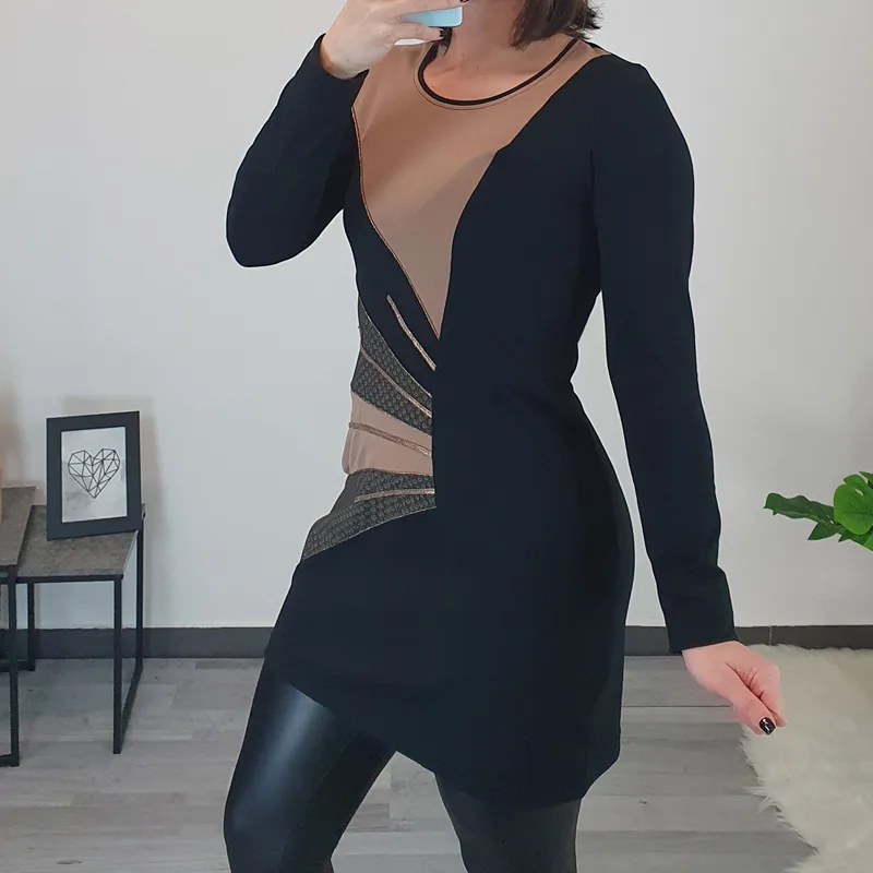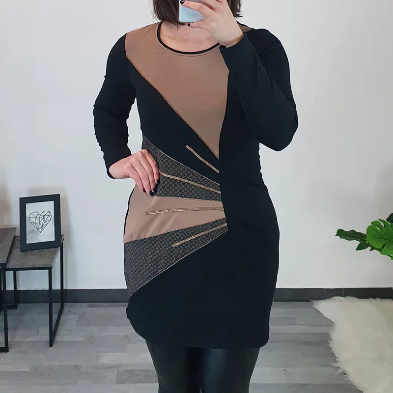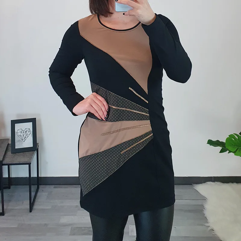 Modna tunika Era v črni barvi. Tunika ima dolga rokava in je rahlo oprijetega modela. Na sprednji strani je kombinirana z blagom v bež barvi in z zlatimi dodatki. Izdelana je iz kvalitetnega bombaža in je udobna za nošenje.
