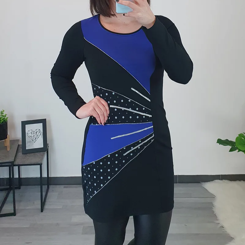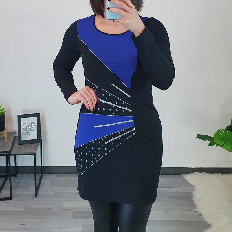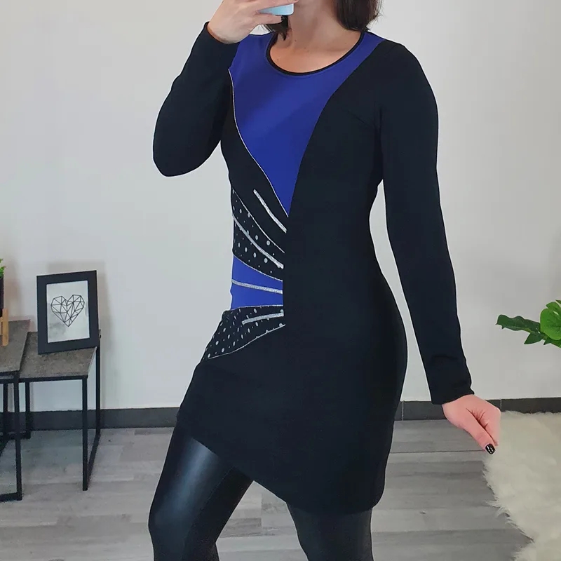 Modna tunika Era v črni barvi. Tunika ima dolga rokava in je rahlo oprijetega modela. Na sprednji strani je kombinirana z blagom v pariško modri barvi in s srebrnimi dodatki. Izdelana je iz kvalitetnega bombaža in je udobna za nošenje.