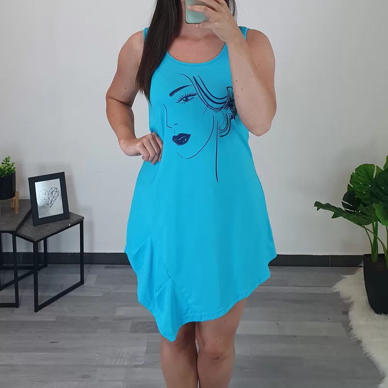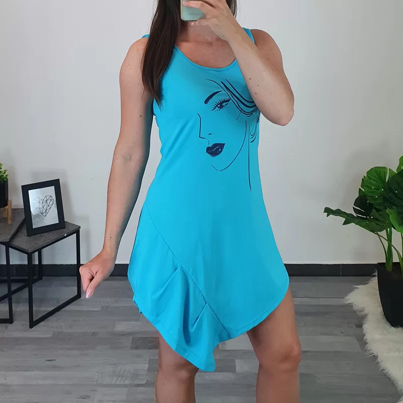 Modna bombažna tunika Gira v turkizno modri barvi. Tunika je asimetričnega kroja in je brez rokav. Na sprednji strani je dodan tisk v temno modri barvi. Izdelana je iz kvalitetne mešanice bombaža in elastana. Na voljo je od številke 36 do 46.