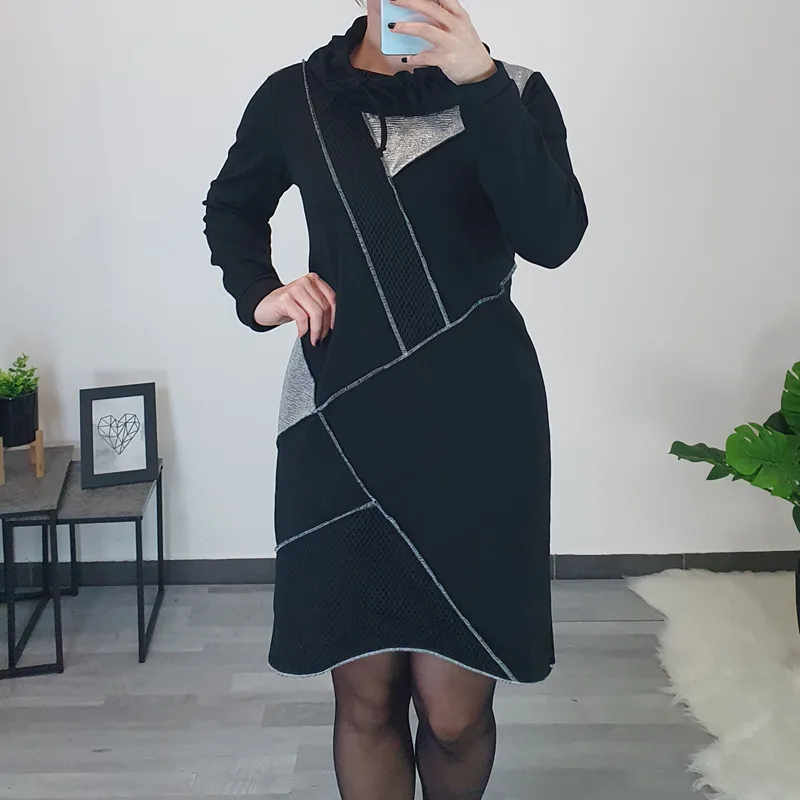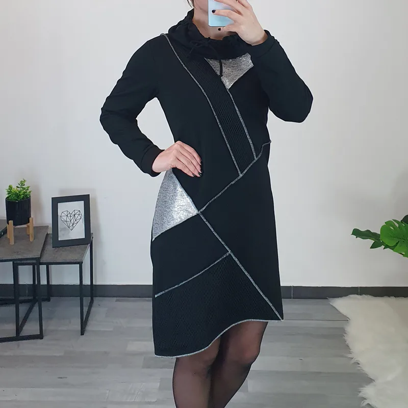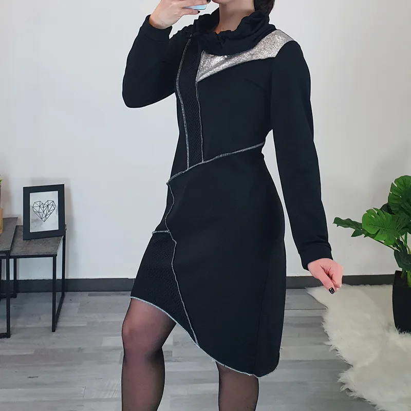 Modna tunika Isha v črni barvi. Tunika ima ovratnik, spredaj je krajša, zadaj daljša. Na sprednji strani jo krasi črna mreža, srebrno blago in zunanji šivi. Izdelana je iz kvalitetnega bombaža in je prijetna za nošenje.