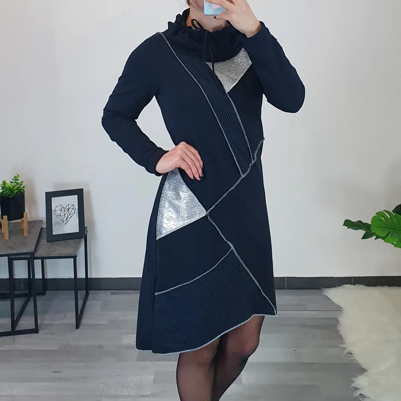 Modna tunika Isha v temno modri barvi. Tunika ima ovratnik, spredaj je krajša, zadaj daljša. Na sprednji strani jo krasi mreža, srebrno blago in zunanji šivi. Izdelana je iz kvalitetnega bombaža in je prijetna za nošenje.
