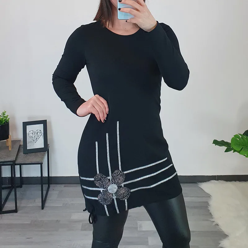 Modna tunika Jula v črni barvi. Tunika je izdelana iz kvalitetne mešanice bombaža in elastana, ter se lepo prilagaja telesu. Tunika je krojena na ‘balon’, na koncu je dodana vrvica s katero tuniko oblikujete. Na sprednji spodnji strani jo krasijo srebrni trakovi in srebrna cvetica.
