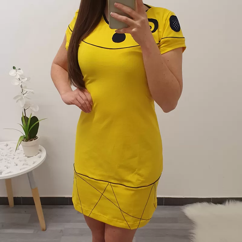 Tunika Kaja s kratkimi rokavi. Tunika je v rumeni barvi, v kombinaciji s črno.