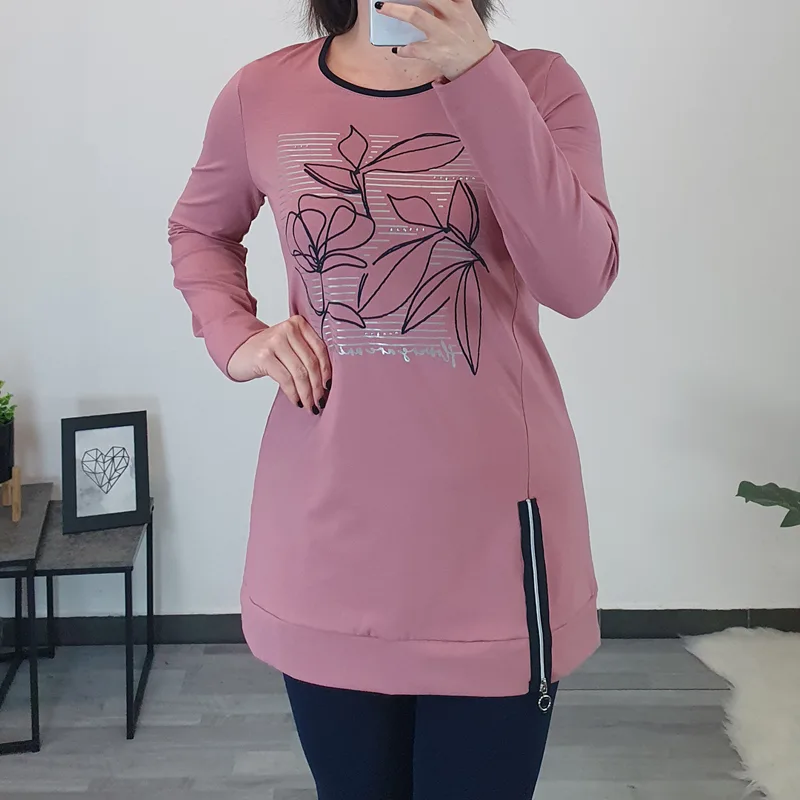 Modna tunika Kamina v roza barvi. Tunika ima dolga rokava in je rahlo oprijetega modela. Na sprednji strani jo krasi temno moder in srebrn tisk ter dekorativna zadrga.