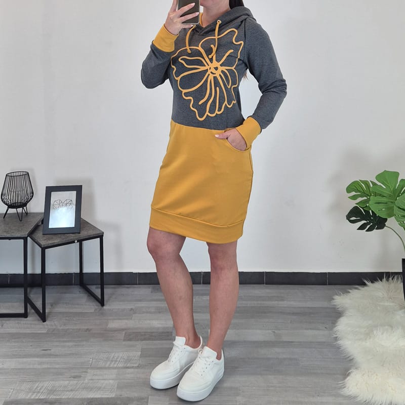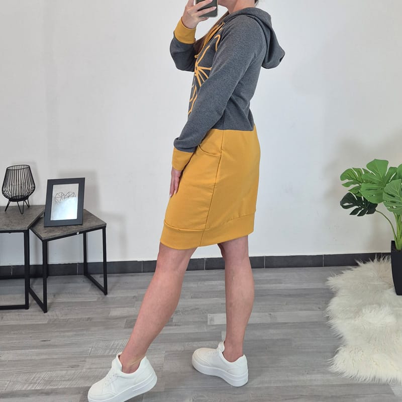 Ženska tunika Lari s kapuco. Tunika ima žepe na levi in desni strani. Ima dolga rokava s patentom, prav tako je patent dodan tudi na spodnji strani obleke zaradi lepše oblike. Zgornji del tunike je v sivi barvi, dodan je rumen tisk v obliki rože. Spodnji del tunike, patent na rokavu in blago v notranjosti kapuce je v rumeni barvi.
