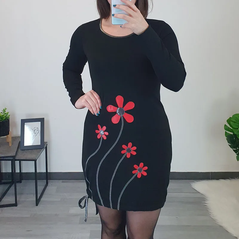 Modna tunika Leri v črni barvi. Tunika je kombinirana s srebrnimi trakovi in rdečimi rožicami. Ima dolga rokava in je rahlo oprijetega modela – na koncu je dodana vrvica s katero poljubno nastavite širino. Izdelana je iz kvalitetnega bombaža in je udobna za nošenje.