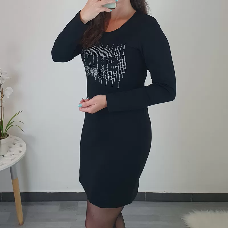 Modna tunika Lidija v črni barvi. Tunika ima dolga rokava in je oprijetega modela. Na sprednji strani jo krasi tisk SHINE v srebrni barvi, kar ji daje zanimiv izgled. Izdelana je iz kvalitetne mešanice bombaža in elastana ter se lepo prilagaja telesu.