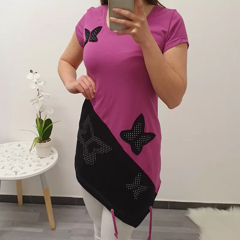 Asimetrična tunika Lina v kombinaciji črne in vijolične barve. Tunika ima našite metuljčke.