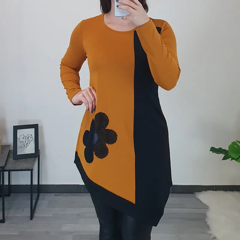 Tunika Liza z dolgimi rokavi v rumeni barvi. Tunika ima na sprednji strani dodano cvetico črne barve.