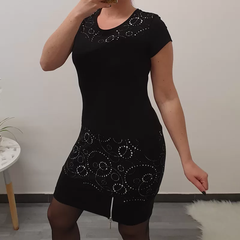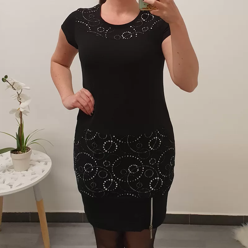 Modna bombažna tunika Manja v črni barvi. Tunika je izdelana iz kakovostnega bombaža in je krojena od številke 36 do 50. Model tunike je oprijet, ima dva stranska žepa, rokava so kratka in se z večjimi številkami podaljšujejo. Tuniki so kot dekoracija dodani beli vzorčki in srebrna zadrga.