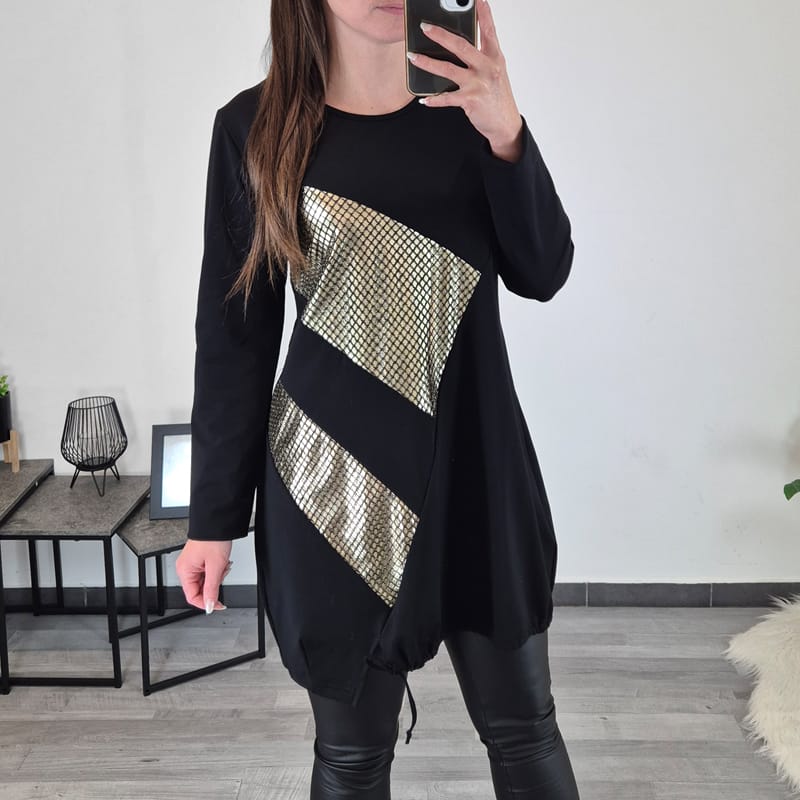 Ženska tunika Marla z dolgimi rokavi. Tunika je v črni barvi, na sprednji strani kombinirana z zlatim blagom in črno mrežico. Krojena je na balon, na spodnji strani je dodana vrvica s katero tuniko oblikujete.